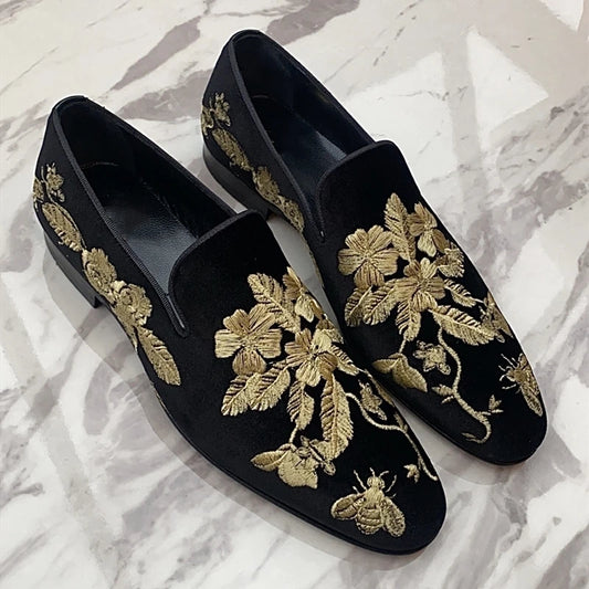Voir le produitMocassins en velours noir avec broderie florale dorée